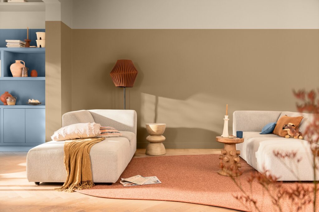 👉 Astuce déco: travaillez avec un aplat de couleur sur la partie inférieure du mur pour créer une lambrissure contemporaine qui apporte douceur et structure à l’espace.